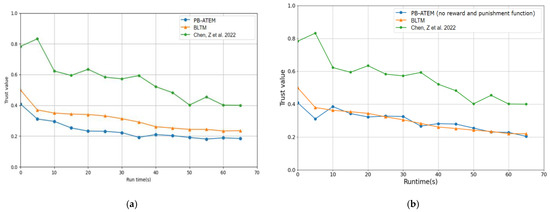 In Figure 4, the changes in integrated trust values of malicious processes in the three models are compared over time. In Figure 4a, it can be seen that in the acceleration of the reward and punishment function, the trust values of the PB-ATEM for malicious processes have been declining over time. In contrast, the models in BLTM and the model in the literature [12] have not established effective reward and punishment functions. Although these models show obvious responses to malicious processes, the trust values for malicious processes in the two models do not change significantly over time, and sometimes malicious processes may not be identified. To intuitively show the role of the reward and punishment function in PB-ATEM, we removed the function from PB-ATEM and compared it with the other two models. As shown in Figure 4b, it is found that the response of PB-ATEM without the reward and punishment function to malicious behavior is slower than before, almost the same as BLTM, because our reward and punishment function is based on the log function, and the value of function rises slowly and falls rapidly. When malicious behavior occurs, the severity of punishment will continue to increase, leading to an accelerated decline in trust value.