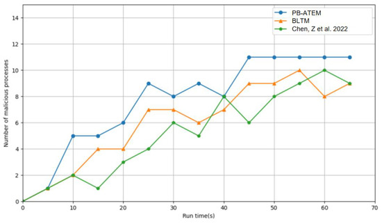 To verify that the model can not only respond quickly to malicious processes but also ensure the stability and precision of the trust evaluation, we selected the trust evaluation model in the literature [12] and the BLTM trust evaluation model in the literature [20], which have been widely used in the research of trust models in recent years. Both comparison models detect malicious behavior based on trust values, following a fundamental process of deriving a comprehensive trust value by calculating sub-trust values and trust weights. However, these comparison models lack adaptability, and their trust weights cannot dynamically adjust according to the detection target. Therefore, we proposed PB-ATEM to address these shortcomings and used PB-ATEM to compare with these two models.