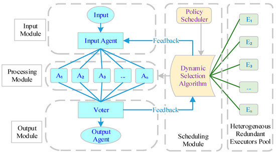 The DHR architecture [12,13] is the core architecture of the CMD, including the components of input agents, executors, voters, policy schedulers, and a pool of heterogeneous redundant executors, as illustrated in Figure 2. The fundamental processing flow of the system is as follows: