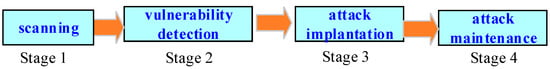 We consider the common attack chain for a system attack, including four stages: scanning, vulnerability detection, attack implantation, and attack maintenance, as shown in Figure 3.