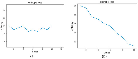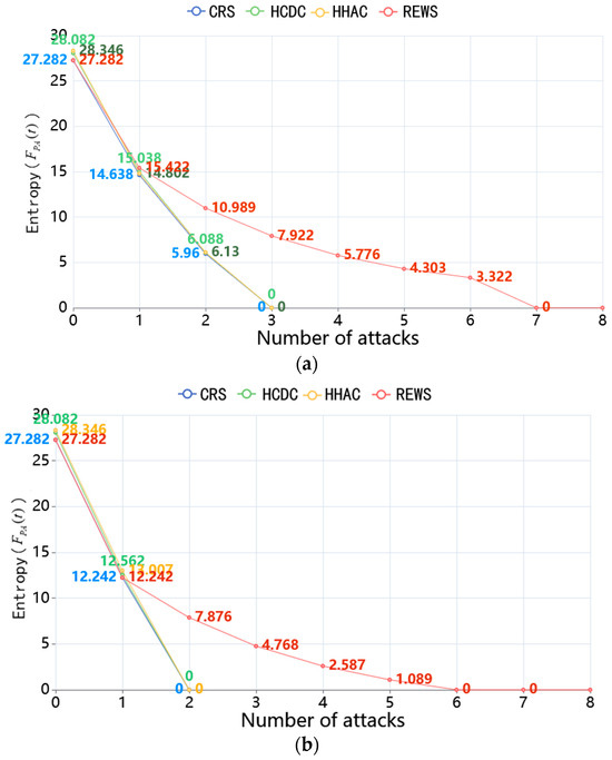 (iii) Finally, under the condition that the decay rate of the information entropy of a single redundant executor is 100% and according to the algorithmic process in Section 4, the scheduling is carried out at the residual degree of m = 3 and 4, respectively, then the trend of the information entropy is shown in Figure 11a,b.