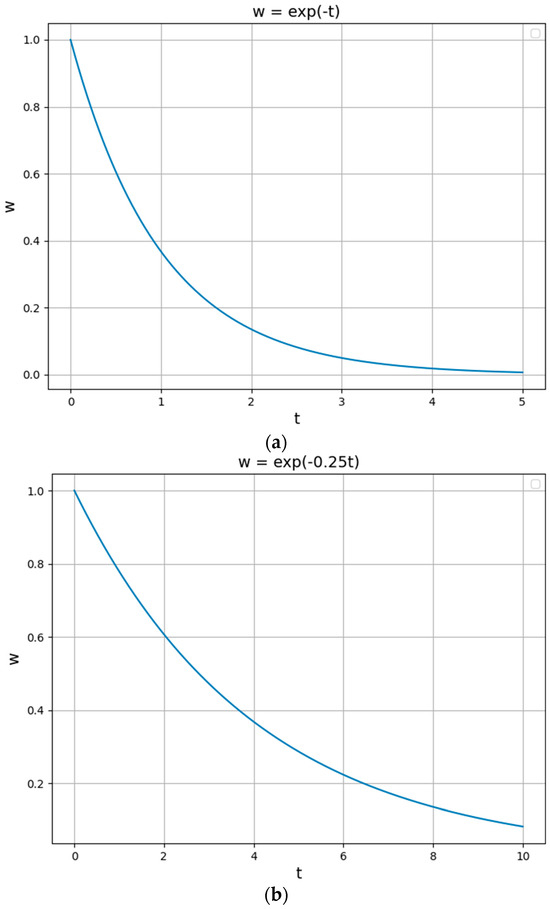 According to the study in Section 3, is a composite function of the attacked state of the redundant executor, where is a monotonically decreasing function on t. Meanwhile, the function for when there is a memory attack and as t increases, the information that can be mined is decreasing gradually, i.e., decreases gradually and . Therefore, in this paper, the function with similar properties is selected to replace the composite function for the approximate solution analysis. Where, is the regulation parameter, w is the entropy weight, and t is the state of the redundant executor being attacked.