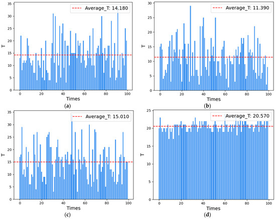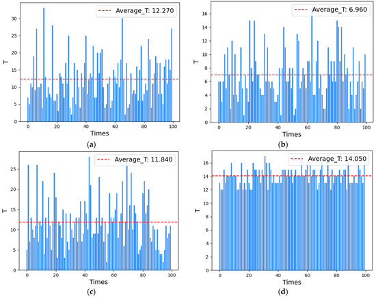 (i) At m = 3, the REWS algorithm is chosen as the weighting function for the experiments. The scheduling period T of the CRS algorithm, the HDCD algorithm, the HHAC algorithm, and the REWS algorithm is shown in Figure 7a–d.