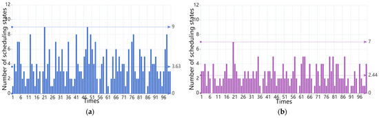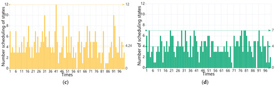 Meanwhile, from the conclusion of the above study, it is necessary to control the range of the scheduling state values within 4.6 and 9.9 times when the margin m is taken as 3 and 4. Therefore, we take 1 and 0.25, respectively, and the results are shown in Figure 6.