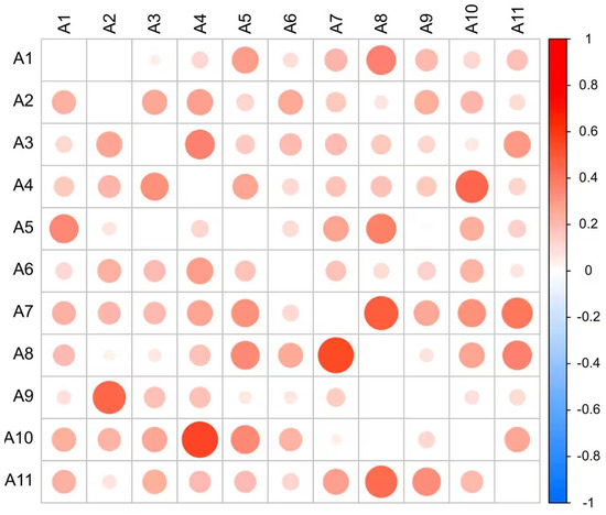 Here, we take industry data from the United States in 2022 as an example to figure out the basic causal linkages (see Figure 1), an interaction matrix for 11 industries is obtained using the PCM technique, and we choose the threshold T = 0.25 to pick out the strong linkages among these (for E = 2 and = 1) [32]. A total of 34 causal combinations were detected, where 18 groups exhibited unidirectional causality; meanwhile, 8 revealed bidirectional causality. The bigger the size of the red circle in the heat map in Figure 1, the higher the degree of the correlation between the two industries, where the horizontal axis is the cause and the vertical axis is the effect.
