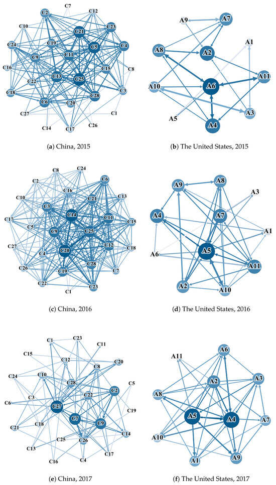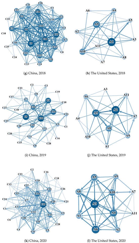 Network density measures the proportion of possible connections that are realized within the network. While the United States’ network demonstrates higher densities throughout the period, peaking at 0.591 in 2020, China’s network density fluctuates more significantly, with values ranging from 0.118 in 2019 to 0.348 in 2016. These differences underscore the United States network’s tendency toward compact and efficient connections, while China’s network adapts dynamically to the economic conditions, particularly in response to external shocks such as the Sino–US trade conflict.