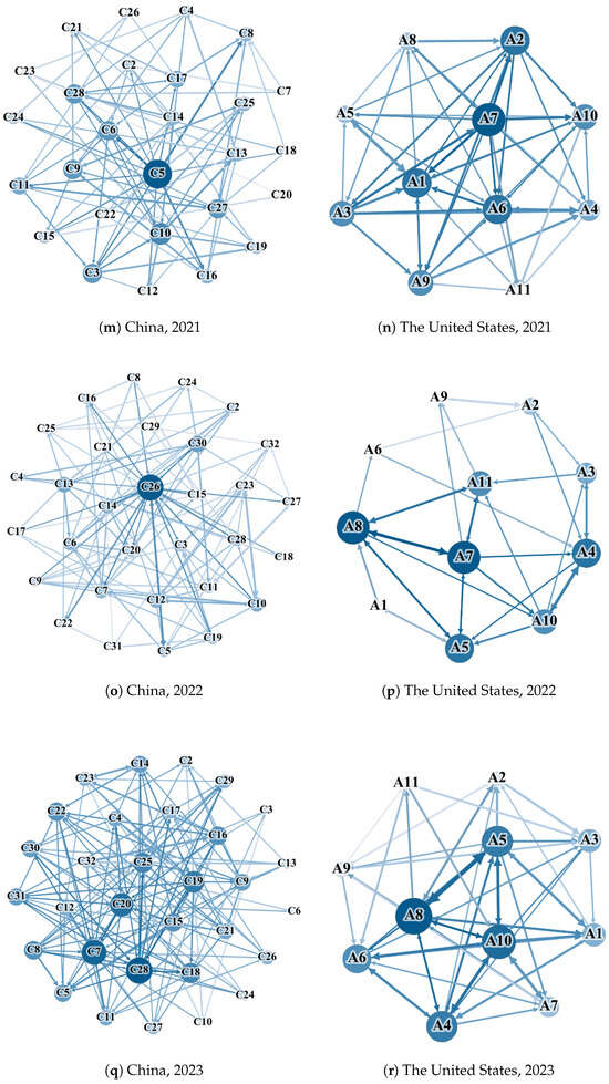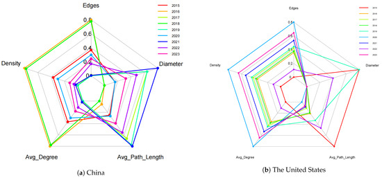 Network diameter, the longest distance between any two nodes, offers insights into the network’s overall spread and connectivity. Both networks show variation in their diameters, with China’s ranging from 4 in 2016 to 9 in 2021 and the United States varying between 3 and 5 throughout the period (Figure 4). The larger diameters in China’s network during certain years suggest a broader and more hierarchical structure, while the consistently smaller diameters in the United States network indicate a more compact and centralized configuration.