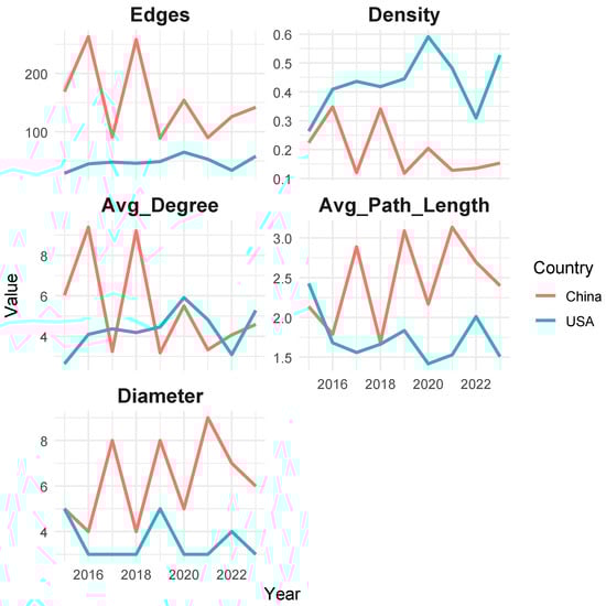 The industrial networks of China and the United States exhibit distinct topological characteristics (Figure 3), reflecting the unique structural dynamics, economic strategies, and resilience mechanisms in each country. By examining key metrics such as the edge count, network density, average degree, average path length, and network diameter over time, this study highlights the critical differences and similarities between the two networks.