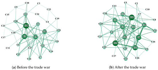 To elucidate the impact of the Sino–US trade war on the causal linkage effects within industry, here, we take China as example and analyze two distinct periods: January 2017 to June 2018 (361 data sets) and July 2018 to December 2019 (368 data sets). We conducted partial cross mapping causal tests for these periods. Figure 5 presents the causal networks from PCM before and after the trade war, while the network topology characteristics are detailed in Table 5.