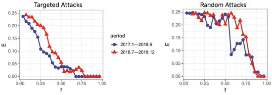 We measure the critical value for network collapse () under deliberate attacks as exceeding 0.75 (The threshold = 0.75 represents the proportion of nodes removed before network collapse, reflecting network robustness. This value is consistent with studies such as [33], which assessed the error and attack tolerance in complex networks. Similarly, ref. [34] highlights as a critical indicator of network resilience in urban systems. While = 0.75 involves subjective elements, its adoption in this study provides a standardized measure for comparing network stability.), which shows that the network withstands failure for longer compared to the pre-trade war period. The higher in the post-trade war period indicates greater resilience, showing the network can sustain functionality despite node failures. This reflects stronger interconnections and structural robustness within the Chinese industrial network after the trade conflict.