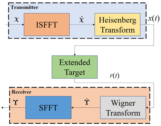 The diagram of the OTFS-based radar is depicted in Figure 1. Firstly, a delay-Doppler domain transmitting matrix is transformed into a time–frequency domain-transmitting matrix using the inverse symplectic finite Fourier transform (ISFFT). Next, the Heisenberg transform is applied to to generate .