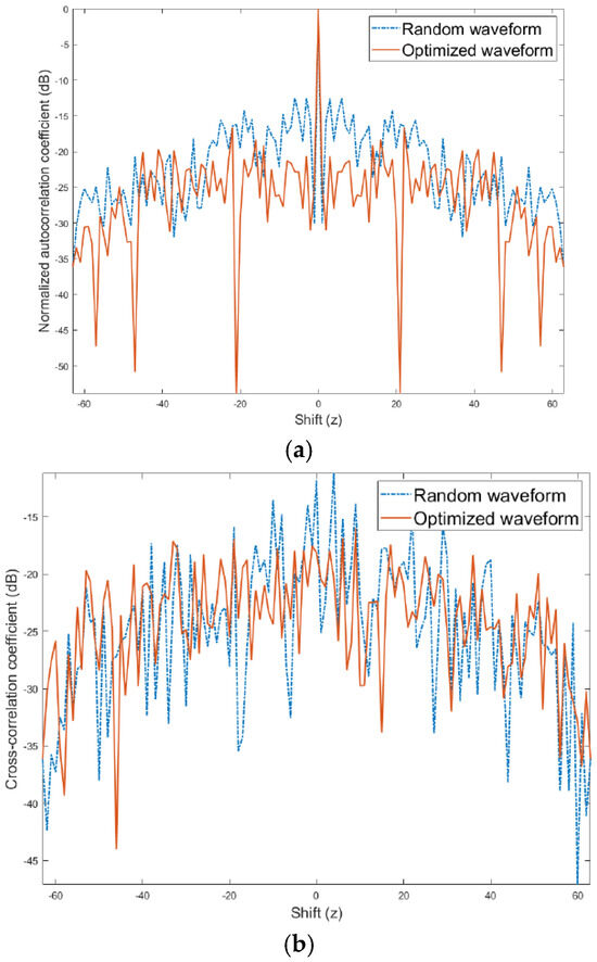 Figure 2 depicts the correlation coefficients of designed by Multi-CAN. Optimized exhibits lower ASaCC when compared to the initial random input. Multi-CAN yields approximately a 10 dB improvement in auto-correlation sidelobes and about a 5 dB improvement in cross-correlations.