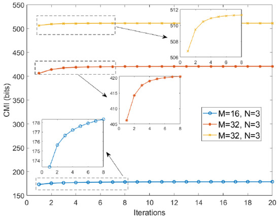 Figure 3 illustrates the CMI corresponding to at different iterations. The following conclusions can be drawn from these results: (1) With an increasing number of iterations, indicating reduced ASaCC of , the sensor captures more information from extended targets. This aligns with the waveform design criteria established in this work. (2) As the size of increases, the system acquires more information from the target. This can be explained by the fact that, under the constraint of constant modulus, a larger implies greater transmitted energy, enhancing the radar system’s capability.