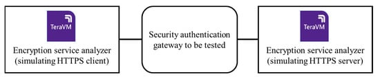 We tested some key indicators of the security authentication gateway products that support PQC algorithms and verified the protocol conformance and system performance before and after the upgrade. In order to effectively test the protocol consistency and performance of the PQC gateway, we developed a PQC test tool based on VIAV’s protocol analyzer TeraVM. This tool supports not only traditional encryption algorithms, but also PQC algorithms, including Kyber512/768/1024, etc. It also supports IETF RFC 9370 [], RFC 9242, RFC 8784, and other protocol standards. This tool supports emulations of both client encrypted flows and server traffic to be encrypted, as well as Per Tunnel, Per Flow KPI measurements. This tool helps evaluate the computational efficiency of PQC algorithms. This includes measuring factors such as encryption/decryption speed, key generation speed, and overall system performance. Ensuring that PQC algorithms are efficient is crucial for their practical adoption. The test topology is shown in Figure 3. We used VIAVI’s encryption service analyzer TeraVM to simulate an HTTPS client and HTTPS server to test the security authentication gateway device.
