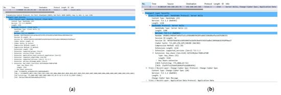 Results of TLSv1.3 handshake. (a) Client Hello protocol message. (b) Server Hello protocol message.