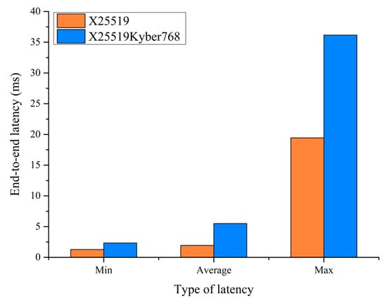 Next, we tested the transmission latency performance of the encryption service before and after the upgrade. The analyzer established TLS1.3 connection requests and simulated 40,000 users initiating HTTPS requests at a rate of no less than 2000 per second. The GET webpage size was set to 64 bytes. We recorded the end-to-end latency of the HTTPS services before and after the upgrade. The results are shown in Figure 5. It can be seen that the end-to-end latency of the PQC/traditional hybrid encryption scheme (X25519Kyber768) is significantly greater than that of the traditional encryption scheme (X25519). According to the IETF’s X25519Kyber768Draft00 hybrid post-quantum key agreement memo, for the client’s share, the Key_exchange value contains the concatenation of the client’s X25519 ephemeral share (32 bytes) and the client’s Kyber768Draft00 public key (1184 bytes). The resulting Key_exchange value is 1216 bytes in length. For the server’s share, the Key_exchange value contains the concatenation of the server’s X25519 ephemeral share (32 bytes) and the Kyber768Draft00 ciphertext (1088 bytes) returned from encapsulation for the client’s public key. The resulting Key_exchange value is 1120 bytes in length. The shared secret is calculated as the concatenation of the X25519 shared secret (32 bytes) and the Kyber768Draft00 shared secret (32 bytes). The resulting shared secret value is 64 bytes in length. Therefore, when executing the X25519Kyber768 hybrid encryption algorithm, the client and server conducted a dual round of key negotiation, and the key generation process for Kyber768 is comparatively sluggish compared with traditional encryption algorithms. This factor emerges as the principal contributor to the elevated end-to-end latency observed in PQC encryption services, surpassing that of traditional encryption methodologies.