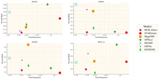 In our efficiency study, we evaluated the DG3L model’s performance across four datasets, PEMS03, PEMS04, PEMS08, and METR-LA, comparing it with other state-of-the-art models. According to the results illustrated in Figure 4, for the PEMS03 dataset, DG3L, with 332,556 parameters, outperformed MegaCRN in terms of overall MAE and exhibited strong parameter efficiency. On the PEMS04 dataset, it maintained competitive accuracy with 311,285 parameters, showing a lower MAE than MegaCRN and demonstrating considerable efficiency. The PEMS08 dataset highlighted DG3L’s superior accuracy with 306,957 parameters, once again surpassing MegaCRN in overall performance. In the METR-LA dataset, while DG3L achieved excellent parameter efficiency with 286,733 parameters, D2STGNN managed a marginally better MAE. Throughout these analyses, DG3L consistently exhibits a favorable balance of parameter efficiency and competitive accuracy across diverse settings without compromising its performance.