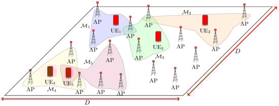 A UC CF system is assumed in which the k-th UE is supported by a set of APs, chosen among the M possible single-antenna APs within a m2 coverage area, as shown in Figure 1.