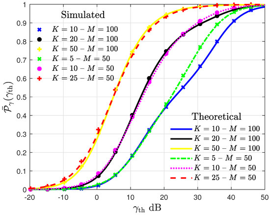 A simulator based on three-dimensional ray-tracing is proposed in [28]. In particular, the authors highlight the ability to simulate power amplifiers based on Rapp’s non-linear model. In the proposed cluster definition method, the Reference Signal Received Power (RSRP) between the UEs and the APs is the input to the cluster formation algorithm. The results show that a greater number of APs serving UEs improves the profile of the empirical cumulative density function (eCDF) curve for the average received signal strength (RSS) rate. According to the evolution of the curves, the improvement in performance tends to stop after an AP/UE of 6. Although ray-tracing simulators are valuable tools for the system design, it is worth mentioning that for real-time applications, EC and OP expressions, such as the ones we propose, may be preferable due to their abilities to predict the system state without the need for performing a usually time-consuming simulation. Additionally, for fast-varying channels, the OP value acts as a better metric than the RSRP, because, due to the channel’s nature, the observed RSRP value may be misinterpreted.
