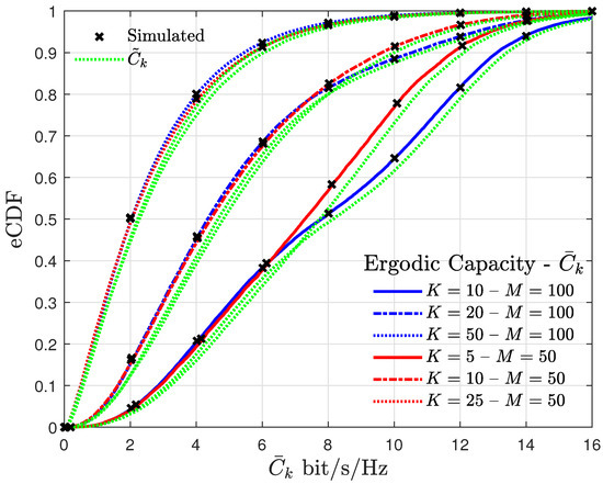 In this study, the signal is transmitted over a frequency-non-selective and slow SSF channel. Hence, the normalized EC can be calculated by averaging the instantaneous capacity, conditioned to a given SINR , by the PDF of the channel SINR [35]. This assumption is consistent with the fact that the multiuser interference tends, by the LCLT, to a complex white Gaussian sequence that is added to the receiver’s white Gaussian noise. Thus, for the CF system, the k-th UE EC can be expressed by