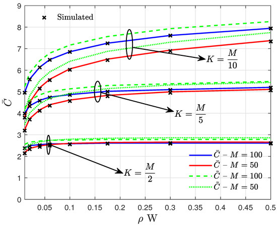 The rise in inflection points, similar to the ones observed in Figure 2 and Figure 3 for and , observed in Figure 5 for and , may be justified with the increasing probability of disjoint sets as the numbers of assigned APs to each UE decrease. Additionally, one can notice that increasing leads to a worse system performance, which is justified by the growth of as predicted by (17).