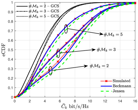 Curves of eCDF generated from EC expressions calculated for GCS and Beckmann effective channel gain models are presented in Figure 5 and compared with the upper bound provided by Jensen’s inequality. For the results in Figure 5, is assumed, so that the estimation error can be neglected. It is observed that, when the scenario exhibits AP-to-UE links in LoS, the EC expression derived taking the GCS as the effective gain distribution fails to predict the per-UE EC. On the other hand, for , the envelope of the effective channel gain degenerates to the modulus of a Gaussian random variable, which is a special case of the Beckmann distribution. Thus, the results obtained using (29) are able to predict the simulated data with a good agreement, in contrast with the results obtained considering the GCS distribution. Furthermore, the improvement achieved by applying an SINR-based AP selection technique is also perceived if a proper channel characterization is used. When Beckman distribution is considered, one can observe that increases from ≈34% to ≈63% when decreases from 5 to 2. On the other hand, the obtained gain for GCS fading model is approximately only 4%.