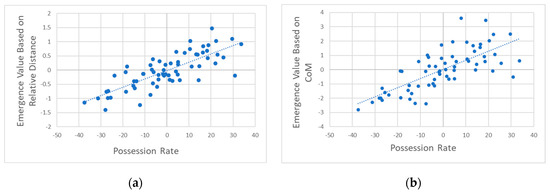 Correlation of differences in causal emergence based on aggregate positioning metrics and ball possession rates. (a) Causal emergence based on relative distance exhibits a high correlation with ball possession rate, with . (b) Causal emergence based on CoM shows a similar strong correlation with possession rate at .