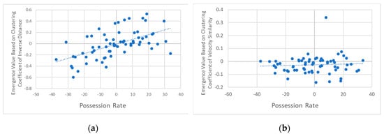 In contrast, causal emergence derived from the clustering coefficient of velocity similarity () showed no meaningful correlation with the ball possession rate . This lack of significant correlation suggests that player velocity alignment alone is not strongly associated with the ball possession rate. While velocity synchronization might reflect localized tactical coordination, it does not appear to directly contribute to the team-level emergent dynamics required for sustained possession.