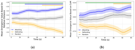 As shown in Figure 6, the causal emergence values for both teams exhibit discernible patterns over the 60 s before a shot. In the first 30 s, neither team’s causal emergence deviates significantly from the values observed in randomly selected intervals, suggesting that their positioning dynamics do not substantially enhance overall emergent behavior during this initial period.