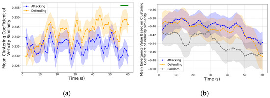 (a) Clustering coefficient of velocity similarity for the attacking team (blue) and defending team (orange) over the 60 s leading up to a shot. Shaded regions represent the standard error of the mean (SEM). While the defending team generally exhibits higher clustering coefficients, statistically significant differences were only observed in the final seconds before the shot, indicated by the green ribbon on top (). (b) Causal emergence values based on clustering coefficients of velocity similarity over the same interval, capturing the emergent properties of velocity coherence.
