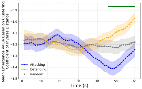 When clustering coefficients derived from inverse distance () were used as the macroscopic feature, a moderate positive correlation between casual emergence and ball possession rate was observed. This suggests that localized spatial formations contribute to higher-level emergent dynamics that are critical for sustaining possession than that of the opposite team. This reflects the ability of teams to integrate local proximities into cohesive, system-wide behaviors that enhance ball control and adaptability during gameplay. In the context of shooting dynamics, causal emergence for the defending team showed a steady increase after the 30-s mark. For the attacking team, a sharp rise in causal emergence occurred in the final 10 s before the shot, contrasting with the relatively stable values observed earlier.