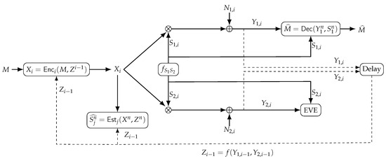 where are i.i.d. Gaussian distributed with zero mean, variance , and independent of . The transmitted message M should be kept secret from the eavesdropper that observes . Finally, the state estimator observes both the channel output feedback