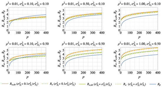 We next list our conclusions for a degraded secure ISAC channel with correlated Rayleigh fading for the parameter ranges given above, drawn from the computations mentioned above. From (60), we observe that is only a function of the transmit power P such that the curves of are the same in all diagrams. From (16)–(18), we observe that (8a) as a summand of and is a function of , P, and the parameter ratios and . Similarly, the upper bound (51) as a summand of is a function of , P, , and and it does not depend on and . The numerical results also indicate that (8b) as a summand of does not depend on and .