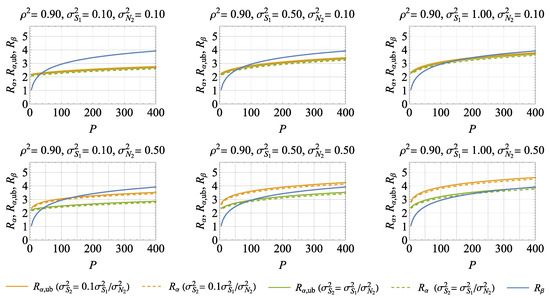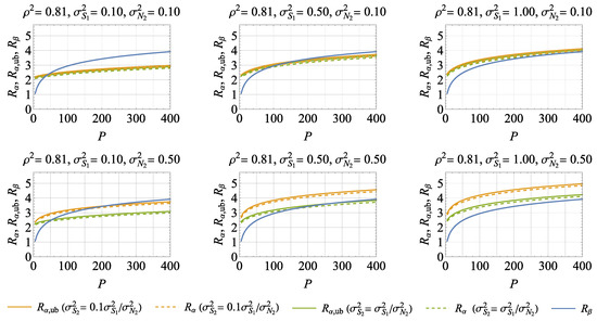 We compute the results for , , and as a function of the transmit power P for different values of the power correlation coefficient . The corresponding curves are shown in Figure 2, Figure 3, Figure 4 and Figure 5. For the matrix of subfigures in each figure, the parameter is modified from left to right and the parameter from top to bottom, respectively, whereas is fixed. The parameter is modified within a subfigure.