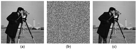 The feasibility of the proposed algorithm was verified by simulation experiments using classical images, namely Cameraman, Peppers, House, and all-black and all-white images, with a size of . The experimental platform was as follows. The hardware part included an AMD PRO A12-9800 R7 3.80 GHz CPU (Advanced Micro Devices, Inc., Santa Clara, CA, USA) and an 8 GB DDR4 RAM (Kingston Technology Corporation, Fountain Valley, CA, USA).; the software part included the Windows 10 operating system and MATLAB R2016A software. The experimental results are shown in Figure 6, where it can be seen that the ciphertext images were in a noisy state, without any plaintext image information displayed, and the decrypted images were visually indistinguishable. After the numerical analysis, the difference between the plaintext image and the ciphertext image was zero.