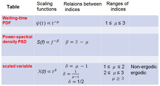 Figure 1 is copied from West et al. [46] and provides easy reference to all the derived relations among the IPL scaling indices for the PSD index , the IPL waiting-time PDF index, and the scaling index for the scaled variable , as well as the scaled PDF. For example, suppose the trajectory crosses a known level at a specific time and we want to know how long we must wait to recross that same level. Given that the waiting-time PDF has the IPL form, we denote the generic IPL index for the waiting-time PDF by the symbol From the parameter relations in Figure 1, it is clear that it is possible to prove that the IPL index is equal to the fractal dimension so that we obtain the following [46,50]: