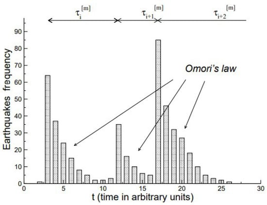 To facilitate subsequent theoretical discussion of various kinds of memory, a few general remarks are in order. These remarks are made in the context of an example concerning the frequency distribution of the magnitudes of earthquakes depicted in Figure 3. Recent geophysical observations indicate that main fracture episodes can trigger long-range as well as short-range seismic effects. Mega et al. [54] point out that earthquakes are grouped into temporal clusters of events, and these clusters are unorrelated from one another, but the intra-cluster shocks are correlated in time as given by Omori’s law. This empirical inverse power law (IPL) states that the main shock, i.e., the highest magnitude earthquake of the cluster occurring at time , is followed by a swarm of correlated earthquakes (aftershocks) whose number (or frequency) of decays in time from the main shock is defined as an IPL. The waiting time between sequential seismic events is determined by the waiting time IPL probability density function (PDF), with the IPL index close to unity in this case.