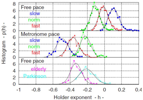 Scafetta et al. [88] point out that walking is accomplished by the two-way exchange between the muscles receiving commands from the nervous system and sending back sensory information that modifies the activity of the central neurons. The coupling of these two complex networks produces a fluctuating stride interval time series that is characterized by MFD properties. These properties depend on several physiological and stress constraints, such as walking faster or slower than normal, as depicted in Figure 5, as well as age and pathology.