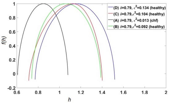 As summarized in [11], the multifractal nature of the stride interval fluctuations become slightly more pronounced under faster or slower paced frequencies relative to the normal paced frequency of a subject, as depicted in Figure 5. The subjects were asked to synchronize their gait with the frequency of a metronome, and the randomness increased. An increase also occurred when the subjects were elderly or suffering from neurodegenerative disease, such as Parkinson’s disease (PD). The supercentral pattern generator (SCPG) model of West and Scafetta [89] was able to reproduce these known properties of walking, as well as to provide physiological and psychological interpretations of the model parameters. The control of SRV as indicated by the changing width of its empirical MFD is distinctly different from that observed, for example, by the PSD associated with HRV, as discussed using a Langevin equation to determine the MFD width of the PSD [46].