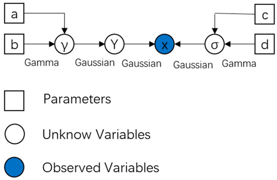 In the equation, and . Since the inverse Gamma distribution is conjugate to the Gaussian distribution, we adopt a Gamma distribution prior for each element of , which can be expressed as: