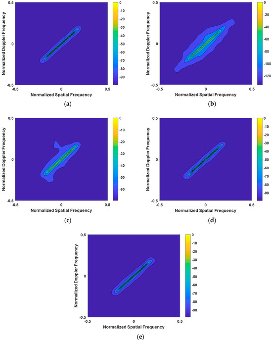 Clutter Power Spectrum under Ideal Conditions. (a) OPT; (b) LSSME-SR-STAP algorithm; (c) Homotopy-SR-STAP algorithm; (d) VB-SR-STAP algorithm; (e) IVB-SR-STAP algorithm.