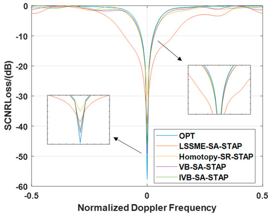 In ideal scenarios, the experimental results presented in Figure 5 reveal a compelling discovery: The SCNR Loss curve of the LMSSE-SR-STAP algorithm exhibits the most prominent notch width. Compared to the VB-SR-STAP algorithm and the IVB-SR-STAP algorithm proposed in this paper, the SCNR loss curve of the Homotopy-SR-STAP algorithm also displays a relatively wide notch, albeit less pronounced than that of the LMSSE-SR-STAP algorithm. Within the mainlobe clutter region, both the IVB-SR-STAP algorithm and the VB-SR-STAP algorithm are able to form deeper notches compared to the LMSSE-SR-STAP algorithm and the Homotopy-SR-STAP algorithm, with both trailing closely behind the optimal performance. It is worth emphasizing that the proposed new algorithm demonstrates its exceptional effectiveness and remarkable clutter suppression capabilities while significantly reducing the computational burden.