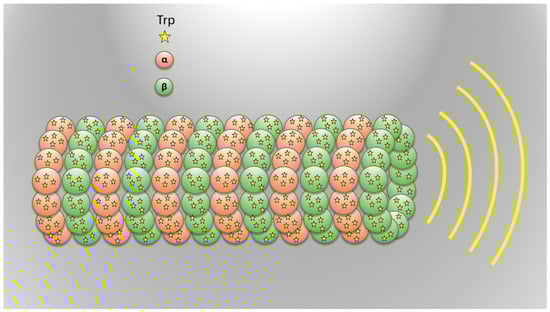 Schematic representation of the cylindrical microtubule structure formed by -tubulin dimers ( in orange, in green), highlighting the tryptophan (Trp) network. The Trp residues are depicted as stars, illustrating their collective emission of light, a phenomenon associated with superradiance.
