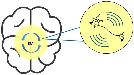 The Conscious Electromagnetic Information (CEMI) Field Theory, proposed by Johnjoe McFadden [23], serves as the foundation for examining the experimentally observed correlations between synchronized neuronal firing and conscious awareness [75]. According to this theory [24,25,26,27], information processed in local neural networks can be transferred to the brain’s EM field, creating disturbances that reflect this information. It suggests that the information integrated into the EM field corresponds to conscious experience, which can then be re-downloaded into neural networks, influencing the firing patterns of motor neurons. A schematic representation of the CEMI field theory is shown in Figure 2.