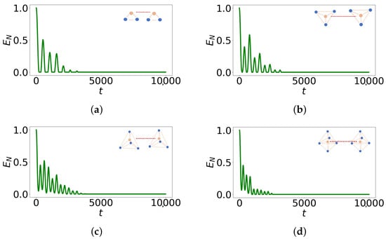 Logarithmic negativity, , of the reduced state composed on the two entangled spins with respect to dimensionless time, t. Here, all the results refer to the model with fully connected buffer spins (for the interaction between spin 2 and spin 6 is missing). (a) . (b) . (c) (d) .