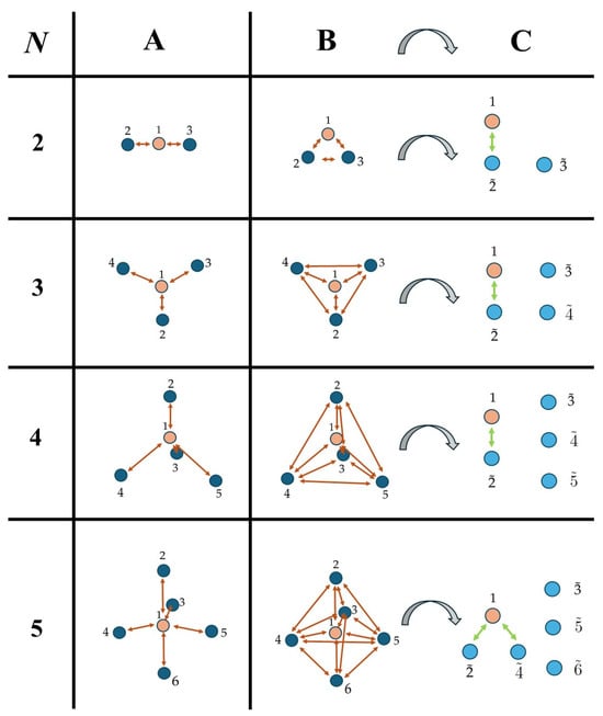 The Pauli spin- operators for the spin are denoted by , , and , and the interaction strength between the spin pair is represented by . The central spin, labeled by “1”, is coupled to the buffer spins at strength in all geometries under consideration. On the other hand, each buffer network is defined by a different array of coupling constants consisting of zero or g values, which can be represented by a planar graph. In other words, we consider two different geometries of the spins in the buffer network: either they do not interact with each other and are coupled only to the central spin (forming a topology that resembles a star graph), or they are fully connected to all the other spins in the system (giving rise to a complete graph). To be precise, for , the fully connected geometry is not a complete graph, as the central spin is positioned right in the middle of the bulk network (more details are given in [29]), hindering the interaction between spin 2 and spin 6, which are uncoupled.