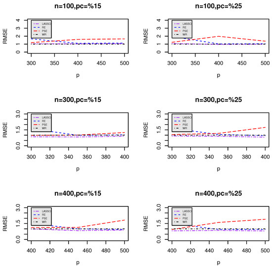 Figure 1 and Figure 2 visualize the RMSE trends for different values of p when comparing LASSO (Figure 1) and ENet (Figure 2) against the proposed estimators (RE and PSE). The plots indicate how RMSE varies as p increases for different sample sizes (n) and censoring levels.