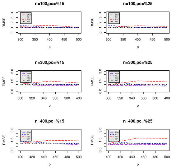 We compare the performance of our proposed estimators against two well-known penalized likelihood methods, namely, LASSO and Elastic Net (ENet). We employ the R package glmnet to fit these penalized methods and choose the tuning parameters via cross-validation. For each combination of n and p, we run 1000 Monte Carlo simulations. Let denote either or after variable selection. We assess the performance using the relative mean squared error (RMSE) with respect to as follows: