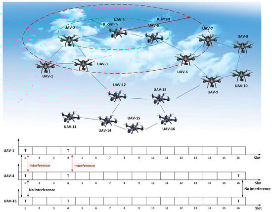 Figure 1 illustrates the interference of three nodes (UAV-1, UAV-4, and UAV-16) in every communication slot. Slot 1 is the transmitting slot belonging to UAV-1. For higher slot utilization, if UAV-4 and UAV-16 also transmit signals in slot 1, UAV-4 will interfere with UAV-1 where UAV-16 will not, and UAV-16 does not interfere with UAV-4. Similarly, if UAV-1 and UAV-4 transmit signals in slot 4, interference occurs for .