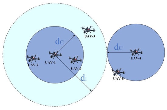 Sixth-generation (6G) wireless networks are expected to provide large-scale connectivity for millions of interconnected devices, providing different quality-of-service (QoS) requirements, ubiquitous coverage, high embedded artificial intelligence (AI), efficient energy utilization, and adaptive network security [1]. Advances in manufacturing technology have led to a reduction in the cost of individual unmanned aerial vehicles (UAVs) while enhancing their mobility, deployment efficiency, and flexibility [2,3]. UAVs should play an important role in the 6G ecosystem, as flight equipment is expected to occupy dense airspace for transportation, monitoring, network relay, and other tasks [4]. UAVs communicate with other UAVs and satellite stations, forming a space–air network, which can become a part of 6G heterogeneous networks. The deployment of large-scale UAVs integrated with highly reliable networks and advanced intelligent collaboration algorithms has become a prominent research focus in recent years. A UAV swarm composed of large-scale small and low-cost drones is expected to achieve higher and greater performance relative to independent drones through collaboration and information exchange.